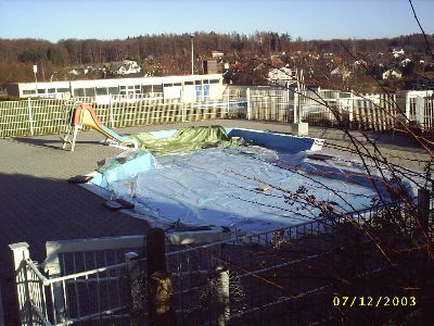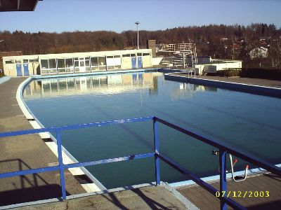 Dies ist das Schwimmerbecken mit den Maßen 50 meter Länge und 20meter Breite und einer Tiefe von 1,80-3,50m.Im Wasser sind Überwinterungsmittel damit das Becken nicht so extrem Veralgt.