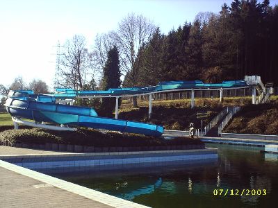Das ist die 81m lange Wasserrutsche die ebenfals Konserviert ist.Der vordere Teil des Becken ist ein Schwimmerteil, und der hintere Teil ein grosszügiges Nichtschwimmerbecken. Auch in diesem Becken befindet sich ein Mittel gegen Algen.